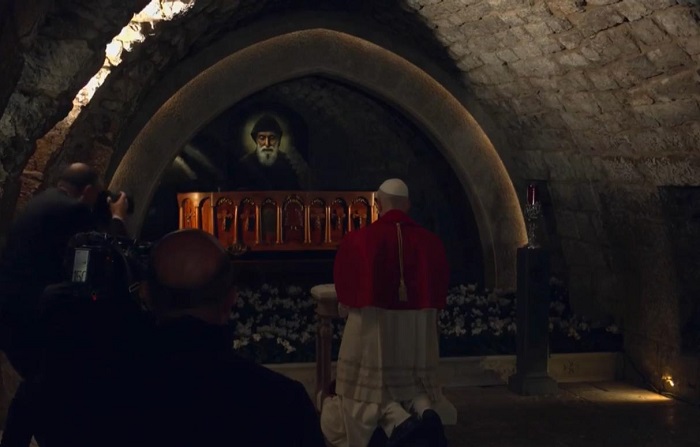 جال البابا لاوون الرابع عشر داخل دير عنايا وسط الترانيم المقدّسة التي ملأت المكان، قبل أن يدخل إلى ضريح القديس شربل حيث ركع بخشوع وصلى داخل القبر. وفي لحظة رمزية مؤثرة، أضاء البابا شمعة كان قد حملها معه من روما خصيصًا لهذه الزيارة، ووضعها أمام الضريح كهدية لدير مار مارون – عنايا.