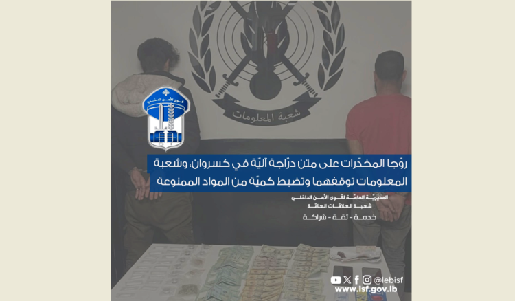 “في إطار المتابعة اليومية التي تقوم بها قوى الأمن الدّاخلي لمكافحة ترويج المخدرات في مختلف المناطق اللبنانية، توافرت معطيات لشعبة المعلومات حول قيام شخصَيْن مجهولَيْن بترويج المخدّرات، على متن دراجة آليّة مجهولة المواصفات في مناطق كسروان.