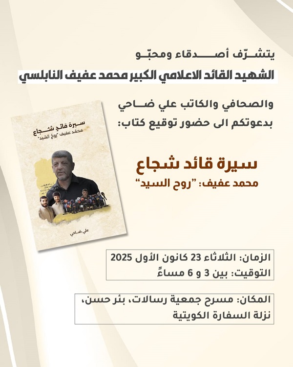 يوقَع الصحافي والكاتب علي ضاحي كتابه بعنوان “سيرة قائد شجاع.. محمد عفيف:روح السيد”.