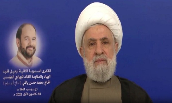 وفي خطاب له خلال الحفل التأبيني لمناسبة الذكرى السنوية للقيادي المؤسس، محمد حسن ياغي، أشار قاسم إلى أن الولايات المتحدة الأميركية «رعت الفساد في لبنان، وحمت رموزه، وعملت منذ عام 2019 على تخريب الوضع الاقتصادي، كما سعت إلى فرض الوصاية، وهي اليوم تتحكّم بكثير من مفاصل الدولة»، لافتاً إلى أن العدوان الإسرائيلي على لبنان لم يتوقّف رغم اتفاق عام 2024.