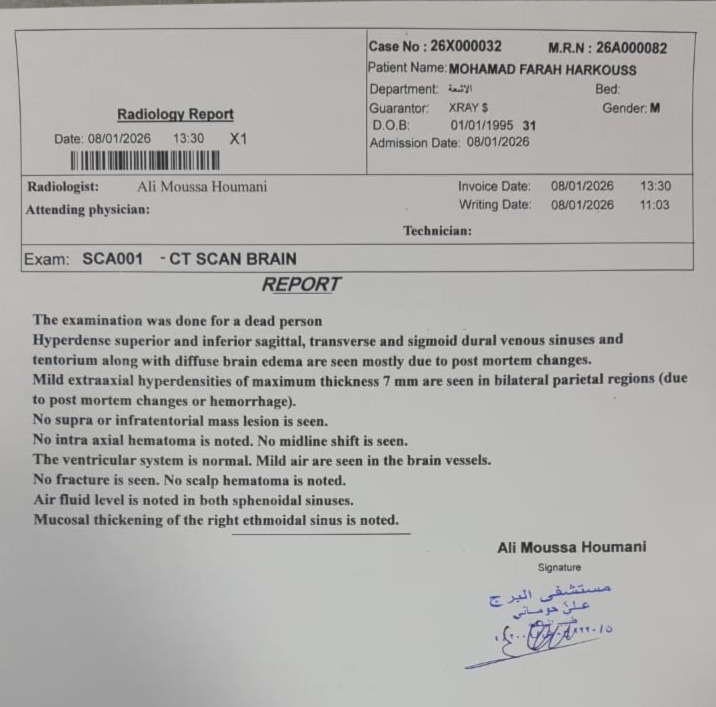 وبحسب المصادر، فإنّ سبب عدم اعتماد التقرير جاء على خلفية استناده على تقرير تصوير طبقي محوري للدماغ صادر عن قسم الأشعة في مستشفى برج البراجنة، تراجع عنه طبيب الأشعة علي حوماني، بعد علمه لاحقاً أنّ الفحص أُجري على شخص متوفي، وليس على قيد الحياة كما ظنّ في البداية، ليعدّ لاحقاً حوماني تقريراً مغايراً من حيث النتائج، حيث أظهر وجود تغيّرات واسعة يُرجَّح ارتباطها بمرحلة ما بعد الوفاة، دون رصد أي كسور في الجمجمة أو أورام دموية في فروة الرأس.