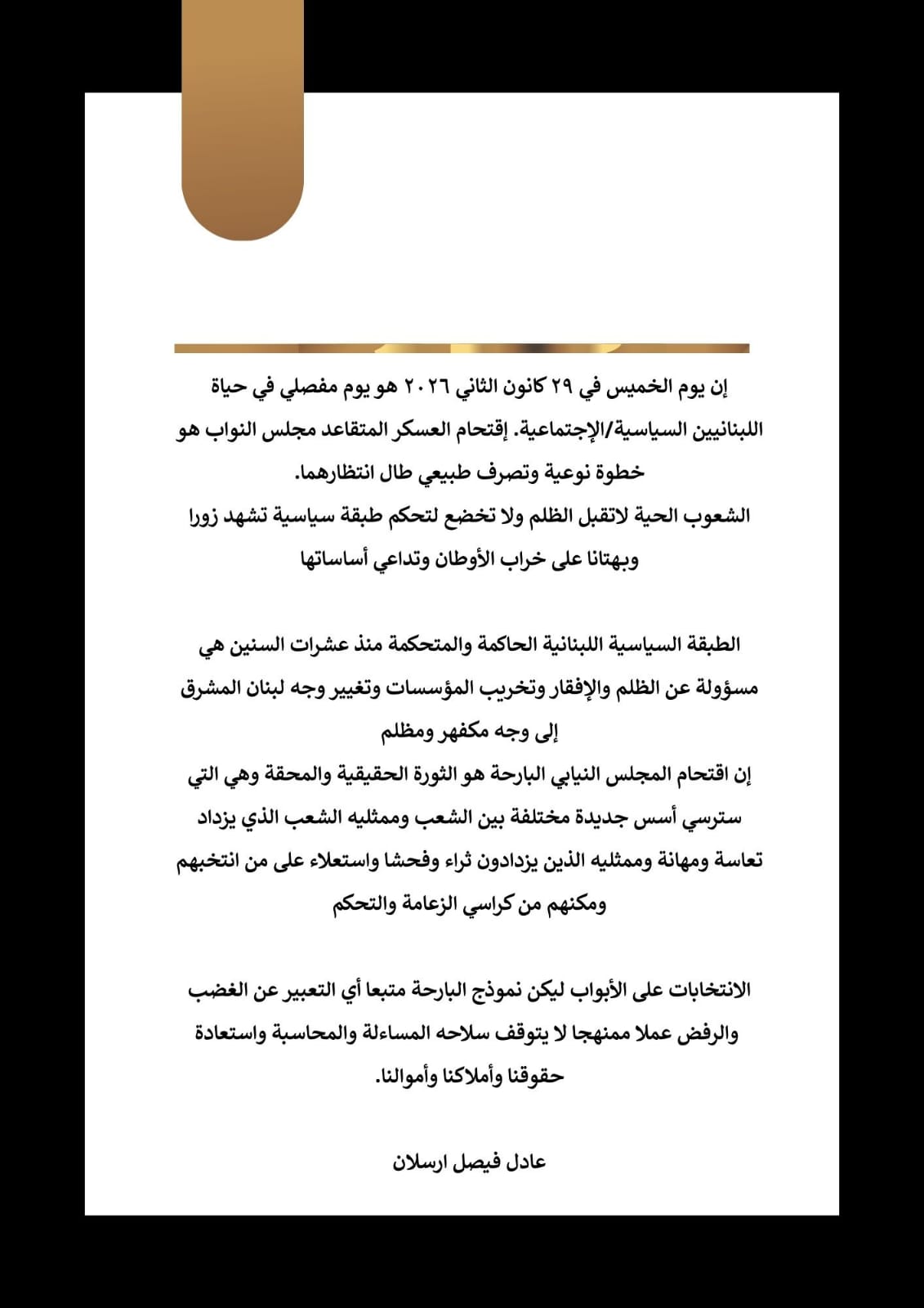 أكد الأمير عادل فيصل أرسلان في تصريح له أن “يوم الخميس 29 كانون الثاني 2026 هو يوم مفصلي في حياة اللبنانيين السياسية والاجتماعية، حيث ان اقتحام العسكريين المتقاعدين لمبنى مجلس النواب خطوة طبيعية طال انتظارها.