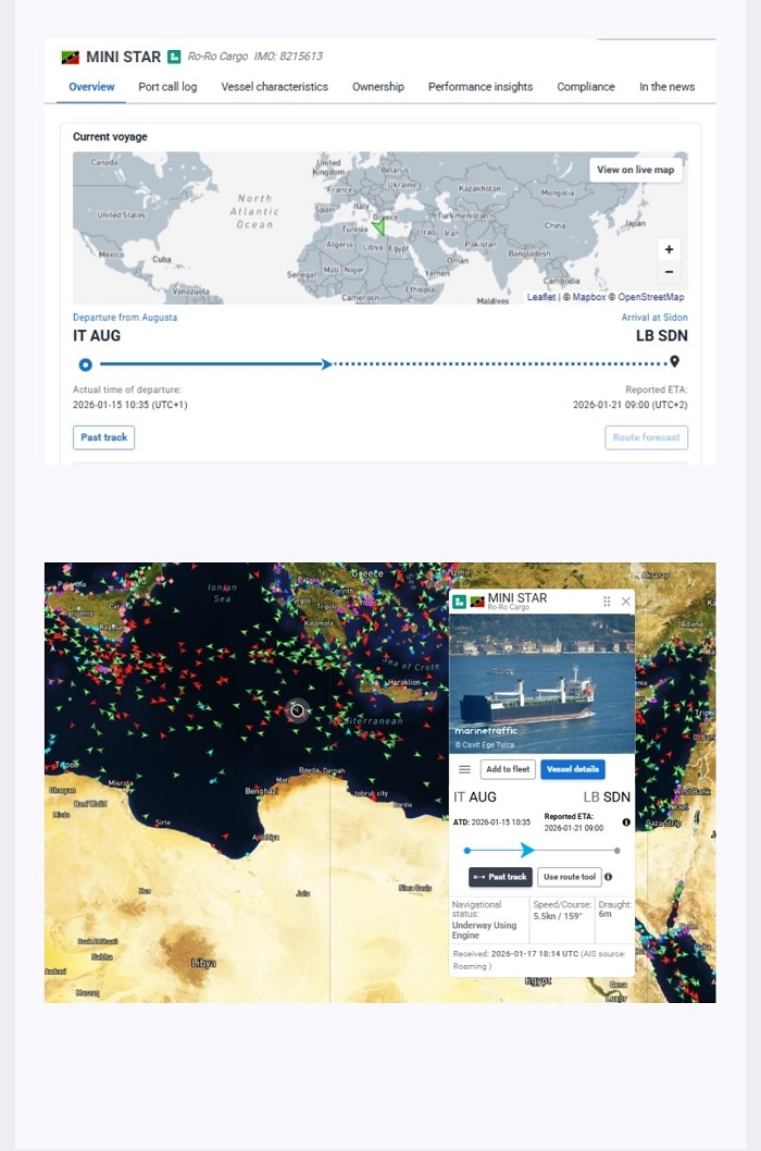 تجدر الإشارة الى ان هيئة الموانئ والنقل البحري الليبية أعلنت بتاريخ يوم الأحد الموافق فيه: 18-1- 2026 عن تعرض السفينة MINI STAR لحادثة غرق، وتم تسجيل بلاغ عن خروج السفينة عن السيطرة نتيجة عطل ومغادرة طاقمها بأمان وتركها مهجورة في عرض البحر قبالة السواحل الليبية، وانها كانت قادمة من إيطاليا الى ميناء صيدا في لبنان وهي محملة بآلات ثقيلة ورخام.