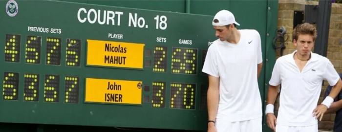 في الدور الأول من بطولة ويمبلدون عام 2010، كتب الأميركي جون إيسنر والفرنسي نيكولا ماهو فصلًا غير مسبوق في تاريخ التنس، بعدما امتدت مباراتهما إلى 11 ساعة و5 دقائق على مدار ثلاثة أيام. المباراة، التي لُعبت من خمس مجموعات، شهدت مجموعة خامسة تاريخية بلغ عدد أشواطها 138، في وقت لم تكن فيه البطولة تعتمد الشوط الفاصل في المجموعة الحاسمة.