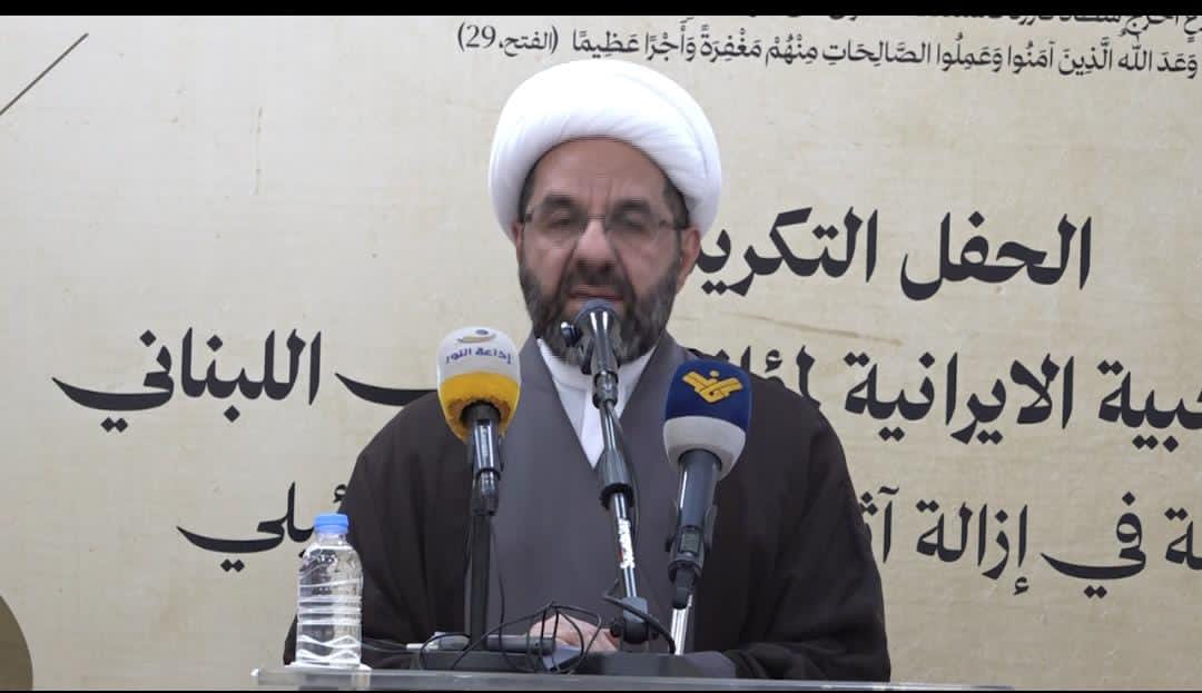 أكد رئيس الشيخ دعموش: المقاومة حق مشروع وستبقى عنوان كرامة لبنان التنفيذي سماحة الشيخ علي دعموش خلال حفل تكريم المجموعات الشيعية الإيرانية والجهادية المؤازرة للشعب اللبناني لإزالة آثار العدوان الصهيوني على لبنان عام 2024 وما بعده، أن حزب الله سيتمسك بحقه في مقاومة العدوان الإسرائيلي المتمادي على لبنان لأن المقاومة حق مشروع وستبقى عنوان كرامة لبنان، ولا يمكن لأحد مهما كان موقعه أن يُلغي هذه المقاومة أو أن يُلغي حقها في الوجود والدفاع، أو أن يشطب من تاريخ لبنان تضحيات المقاومين وما أنجزوه من تحرير وحماية.